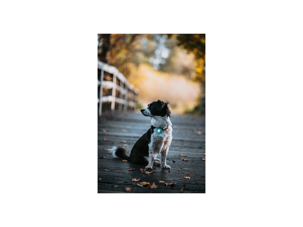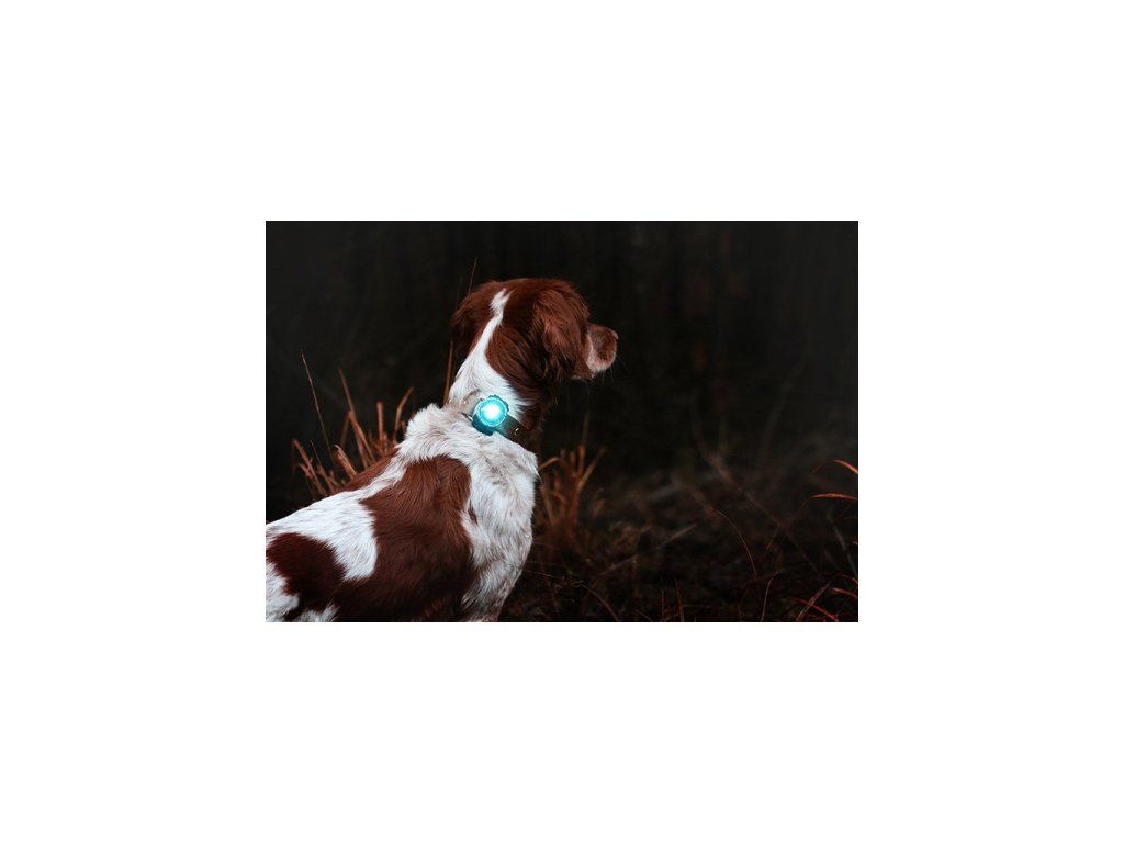 Součástí balení je také nastavitelný silikonový pásek pro uchycení na obojek nebo postroj a vyměnitelná baterie.