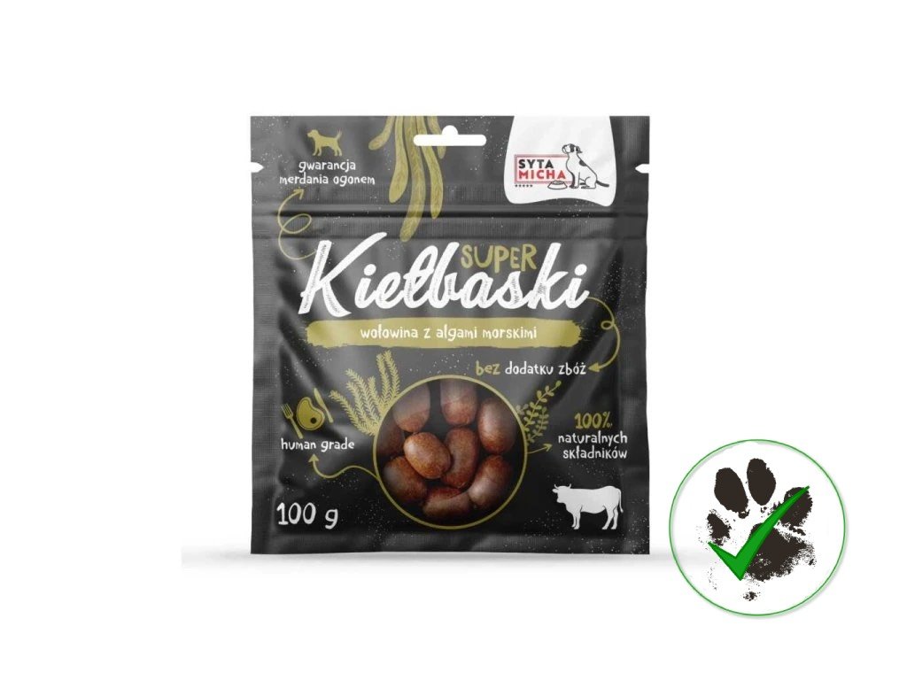 Chcete povznést kulinářský zážitek vašeho chlupáče na novou úroveň? Syta Micha Hovězí klobásky s mořskými řasami jsou z 95 % čistá hovězí svalovina doplněná o mořskou řasu, zdroj důležitých minerálů a aminokyselin.