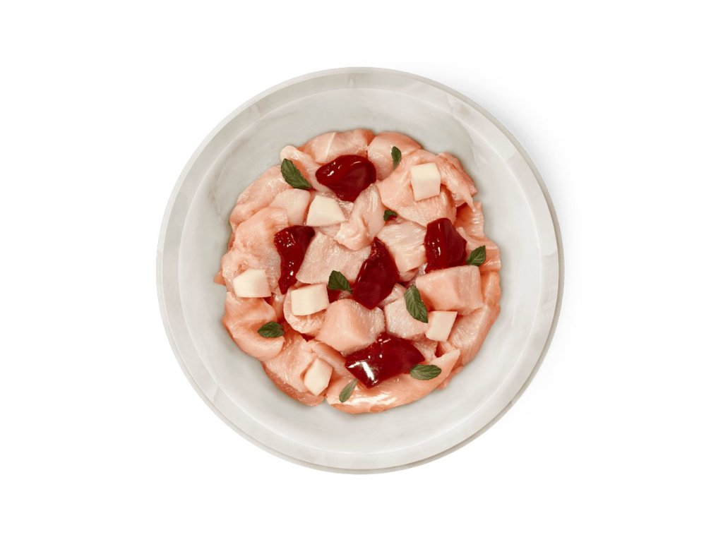 Kuřecí srdce 30 %, kuřecí žaludky 26 %, kuřecí kůže 14 %, kuřecí svalovina 10 %, kuřecí játra 10 %, máslová dýně 4 %, rajčatový prášek, řepkový olej, šanta kočičí*, minerální látky.